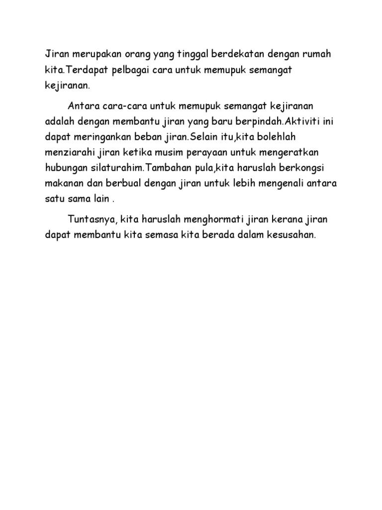 Contoh Karangan Bahasa Malaysia Semangat kejiranan sudah longgar dalam masyarakat kita kalau kita lihat sejak akhi-akhir ini. Perpaduan Masyarakat majmuk seperti Malaysia wajar menghidupkan kembali budaya hidup berjiran. Karangan Kebaikan Memupuk Semangat kejiranan Jiran ialah orang yang tinggal di sekeliling rumah kita iaitu di sebelah di hadapan dan In Contoh Karangan Karangan SPM.